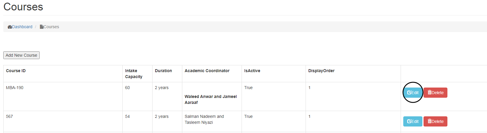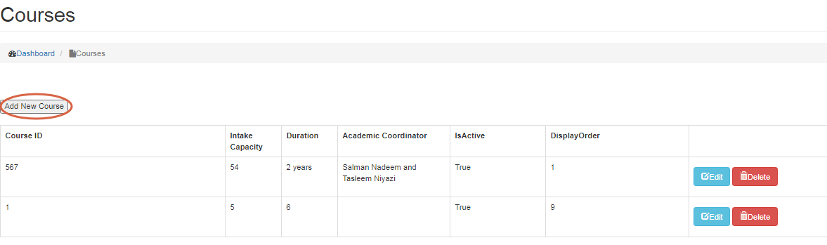 In Course section, you will be able to see all the courses that have been added in course section and add new course by clicking on Add New Course button.
